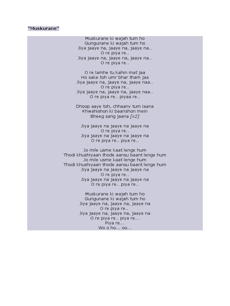 Muskurane Guitar Chords- Citylights. G F Ho sake toh umr bhar tham jaa. Muskurane ki wajah tum ho Gungunane ki wajah tum ho Jiya jaaye na jaaye na jaaye na O re piya re Jiya jaaye na jaaye na jaaye na O re piya re.