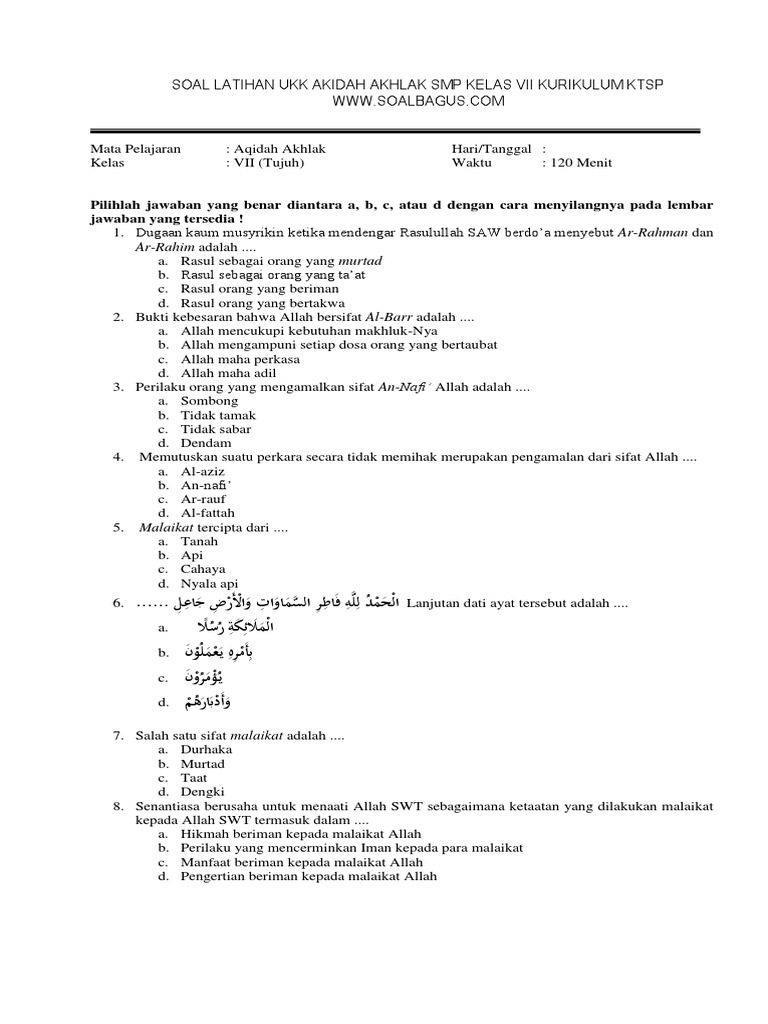 Soal UKK Akidah Akhlak Kelas 7 Dapatkan soal latihan Ulangan Kenaikan Kelas Ujian Akhir Semester tahun ajaran 2019 kelas VII mata pelajaran Akidah Akhlak Madrasah Tsanawiyah Semester II sesuai dengan Kurikulum Tingkat Satuan Pendidikan dan. 20180308 Soal UTS Aqidah Akhlaq Kelas 4 Semester 2 Jawaban Soal Latihan UTS Genap Akidah Akhlak. Penilaian akhir tahun ialah soal evaluasi peserta didik.